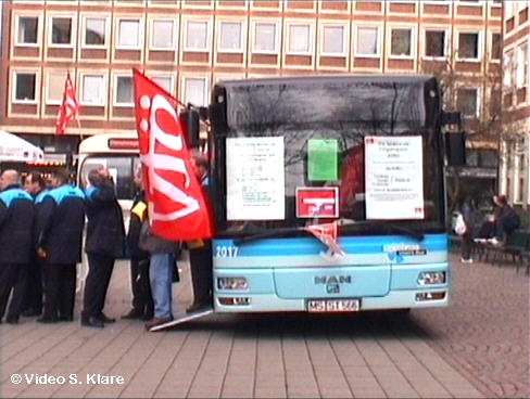 Am gestrigen Dienstag gab es ab 16:30 Uhr zudem eine Kundgebung der Gewerkschaft ver.di. Zu dieser Aktion sind u.a. Mitarbeiter der Verkehrsbetriebe aus Bonn, Gelsenkirchen, Hagen, Mülheim, Oberhausen, Solingen, Wuppertal und sogar aus Hamburg und Kiel angereist, der Verkehr vor dem Hauptbahnhof war deshalb für gut 2 Stunden gesperrt. Neben den altbekannten Themen stand vor allem im Mittelpunkt, dass man in Münster mit der Privatisierung ein Exempel statuieren wolle und dass weiteren Verkehrsbetrieben im Land dann dasselbe Schicksal widerfahren würde.