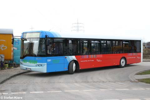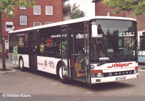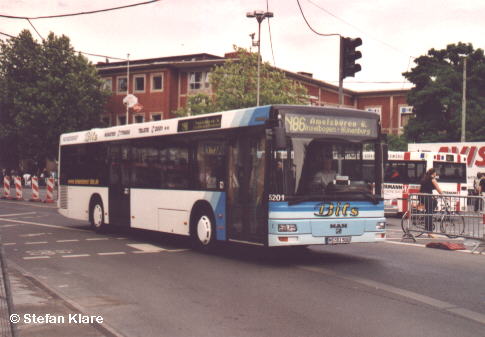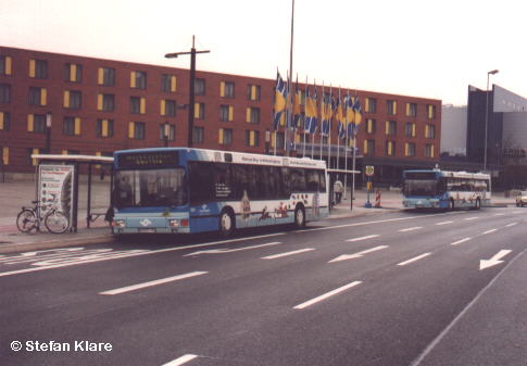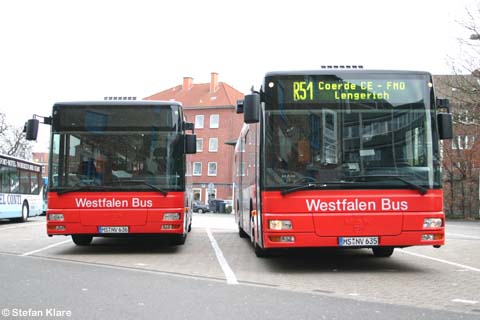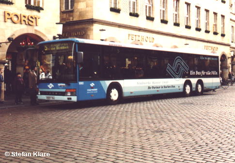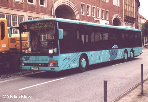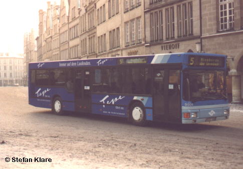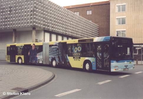 | Die Fa. Weilke aus Greven hat u.a. zwei MAN NM 223 des Baujahres 1999 im Bestand. Wagen 39 wurde hier am 26.07.1999 auf dem Rathausplatz Greven abgelichtet. |