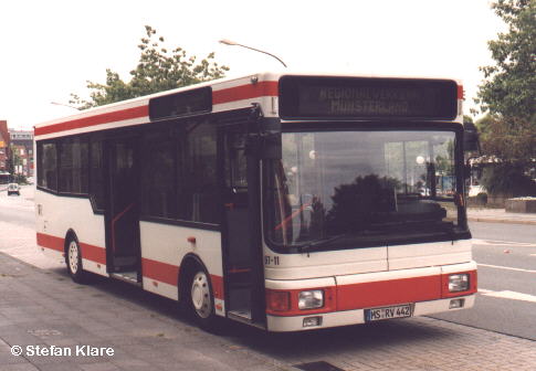 | Unter der Nummer 97-11 hat die Regionalverkehr Münsterland GmbH diesen MAN NM 222 des Jahrgangs 1997 in Betrieb. Das Bild entstand am 26.07.1999 in Ibbenbüren. |