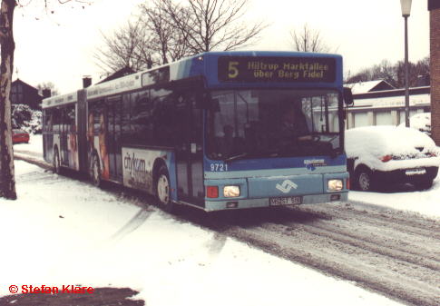 | Dieses Mal ein winterliches Bild: der 1997er MAN NG 262 der Stadtwerke Münster mit der Betriebsnummer 9721 am 25.12.2000 in Nienberge auf der Linie 5. |