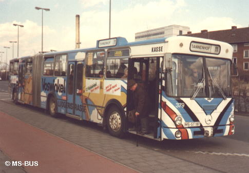 | Neben dem im Besitz der Stadtwerke Münster befindlichen Oldtimerbus Wagen 311 wird auch dieser im Dezember 1974 erstzugelassene MAN SG 192 erhalten. Das Fahrzeug unterhält der OmnibusVerein Münster und ist auf dem Bild zu Beginn der 80er Jahre im Einsatz als Stadtwerkebus Wagen 314 zu sehen. |